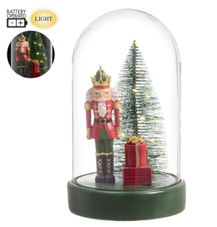 XAT628-RE/GR, BATTERY OPERATED NUTCRACKER IN GLASS DOME WITH LIGHT 11" RED/GREEN
